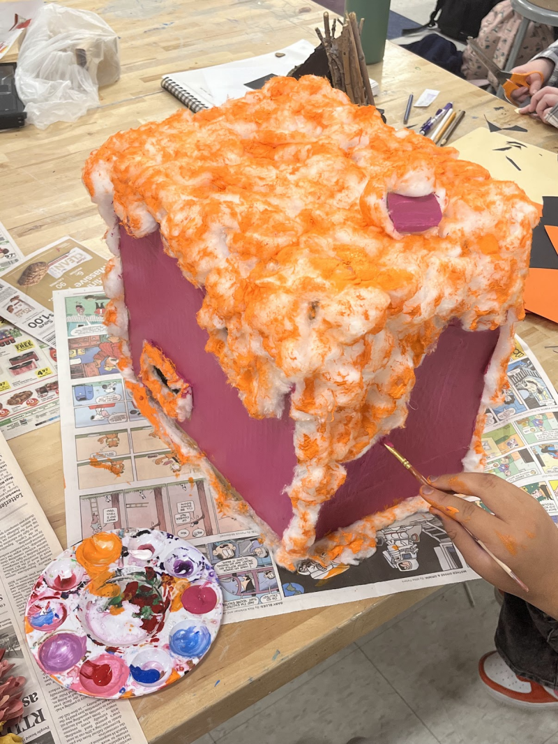 Communication was woven throughout the entire unit, both verbally and in writing. Students practiced articulating their design choices during peer critiques, using art and design vocabulary to give and receive constructive feedback. They also engaged in reflective writing to document their process, challenges, and solutions. During final presentations, students introduced their character and explained how their house’s structure, shape, and style supported that character’s lifestyle and needs. This combination of technical explanation and narrative reasoning demonstrated not only their understanding of sculpture and structure but also their ability to communicate as designers and storytellers.